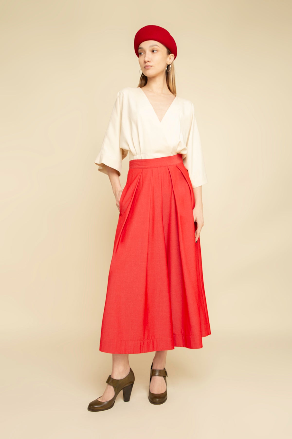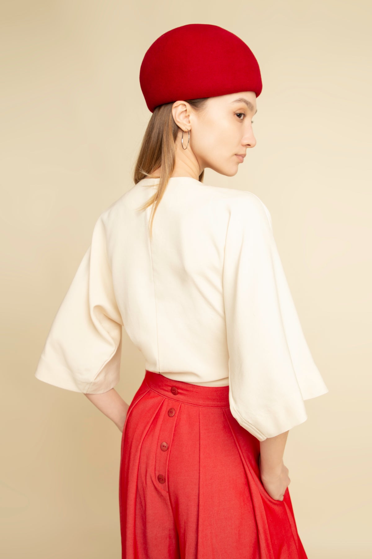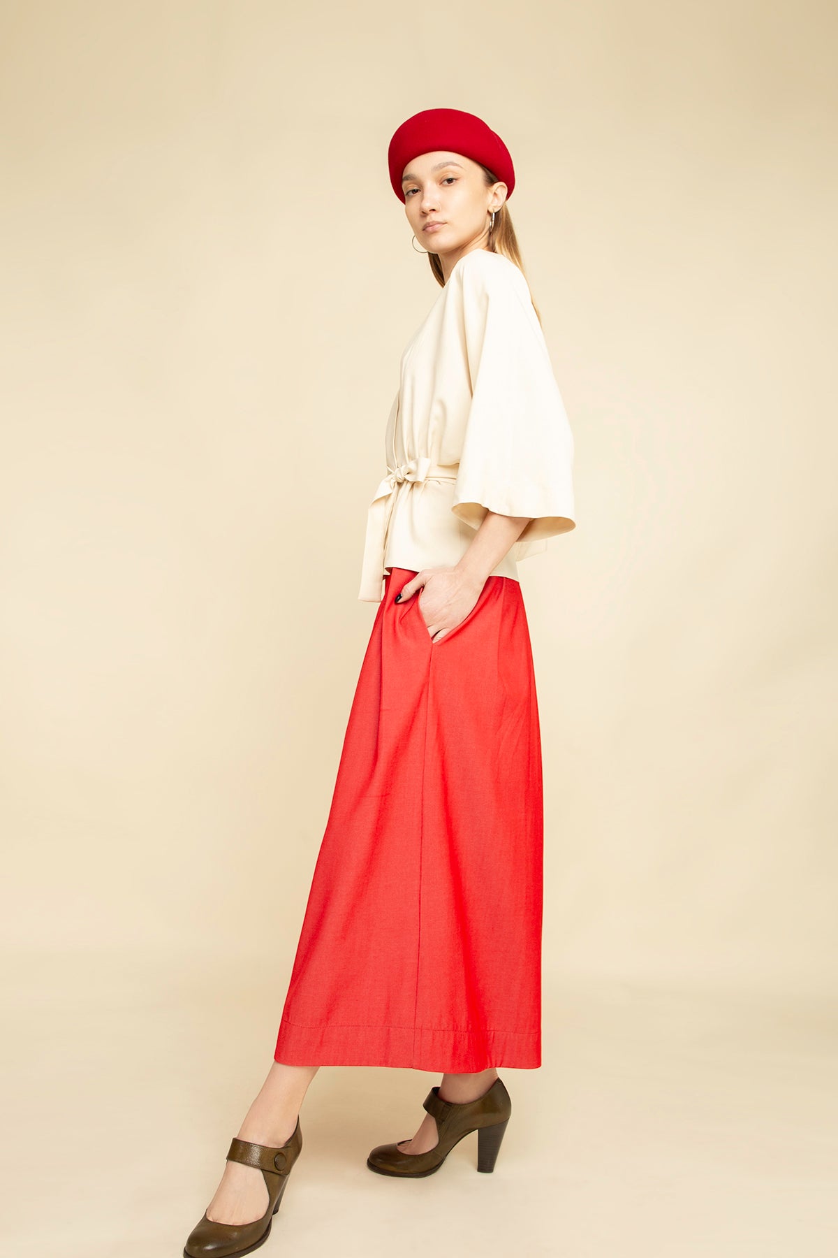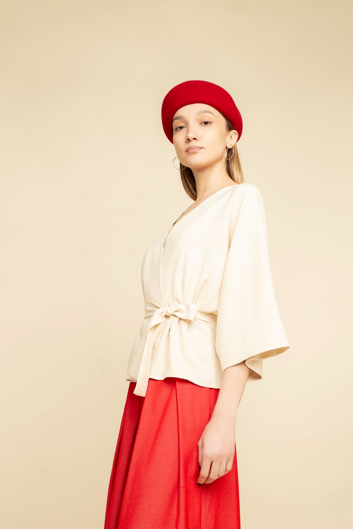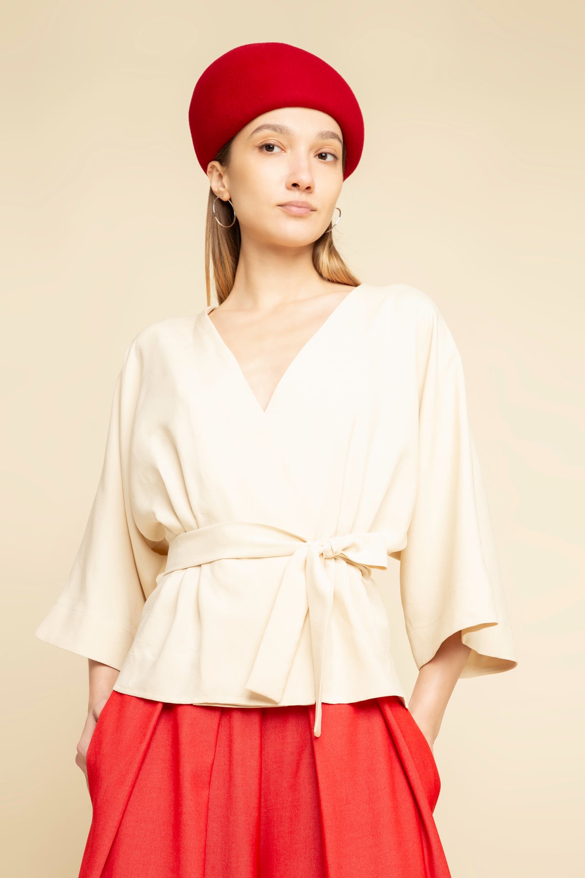 Be effortlessly chic and feminine with this aesthetic homage to a noragi jacket. Mixing the traditional with the modern, this crisp and elegant wrap top in delicate beige silk fabric and comfortable kimono-style cut, with wide, three-quarter sleeves and an open V-shaped front. Cinched at the waist with a self-tie belt to define the waist, it hits at the low hip.