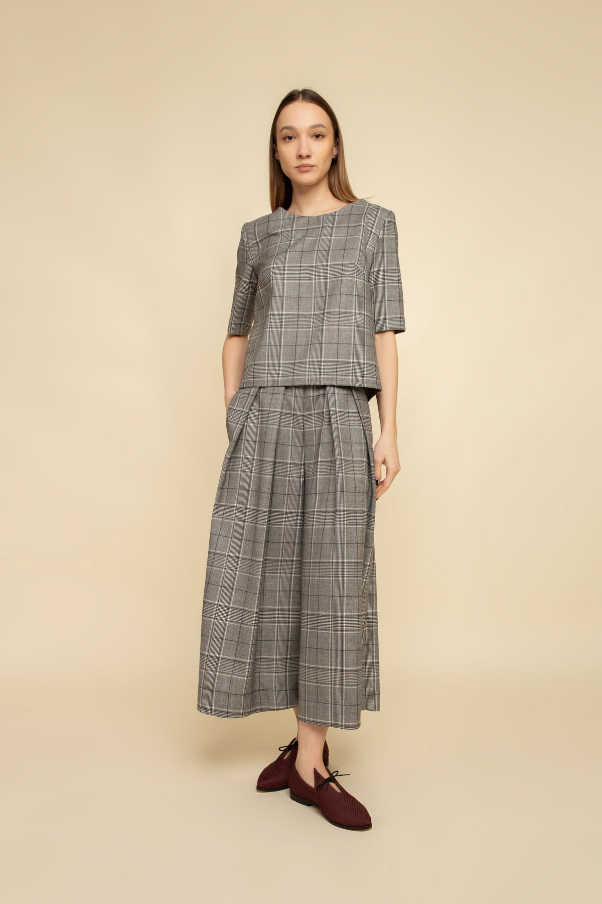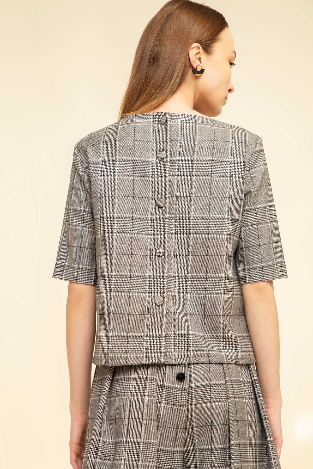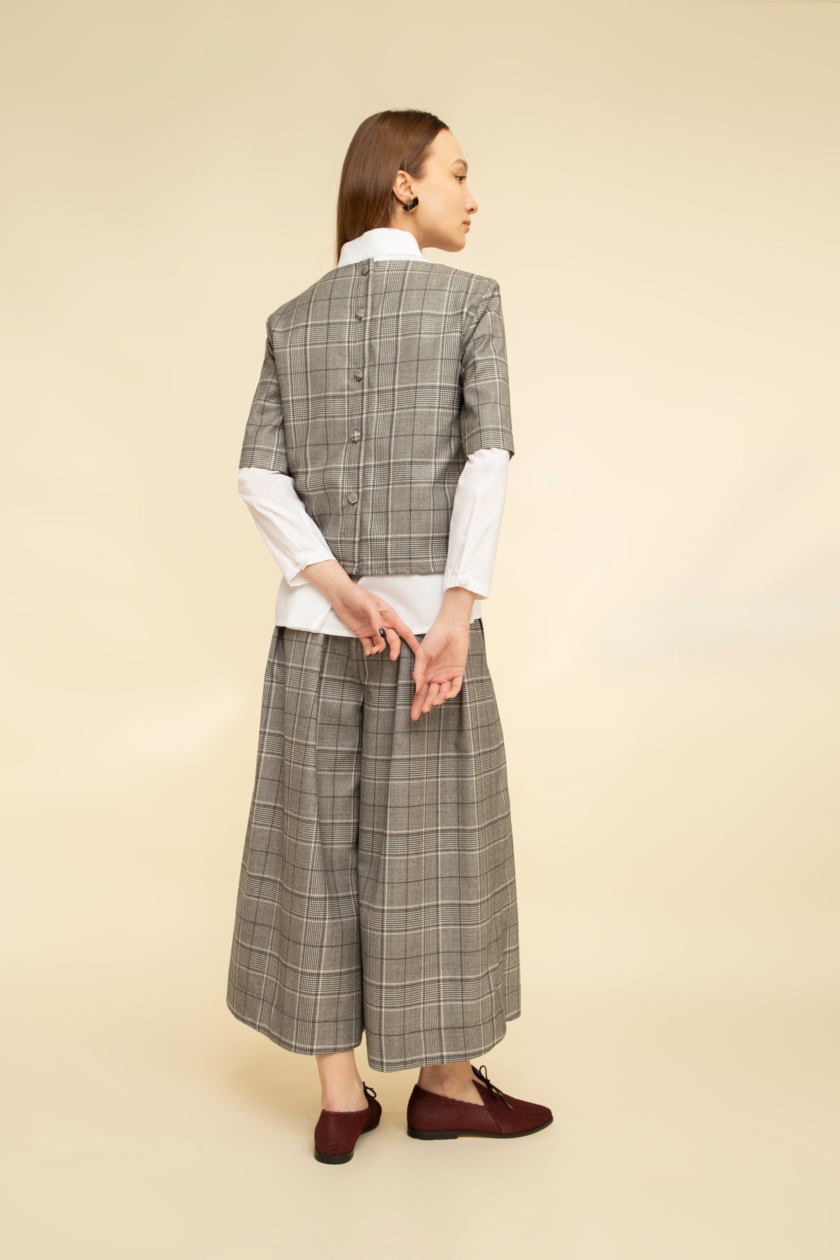 Effortlessly chic, endlessly comfortable. Crafted from 100% breathable lightweight wool, with a dynamic grey plaid print. Relaxed fit, mid-length sleeves and decorative botons on the back. Pairs perfectly with Obi pants. Wear it alone or in layers with Iris white shirt.
