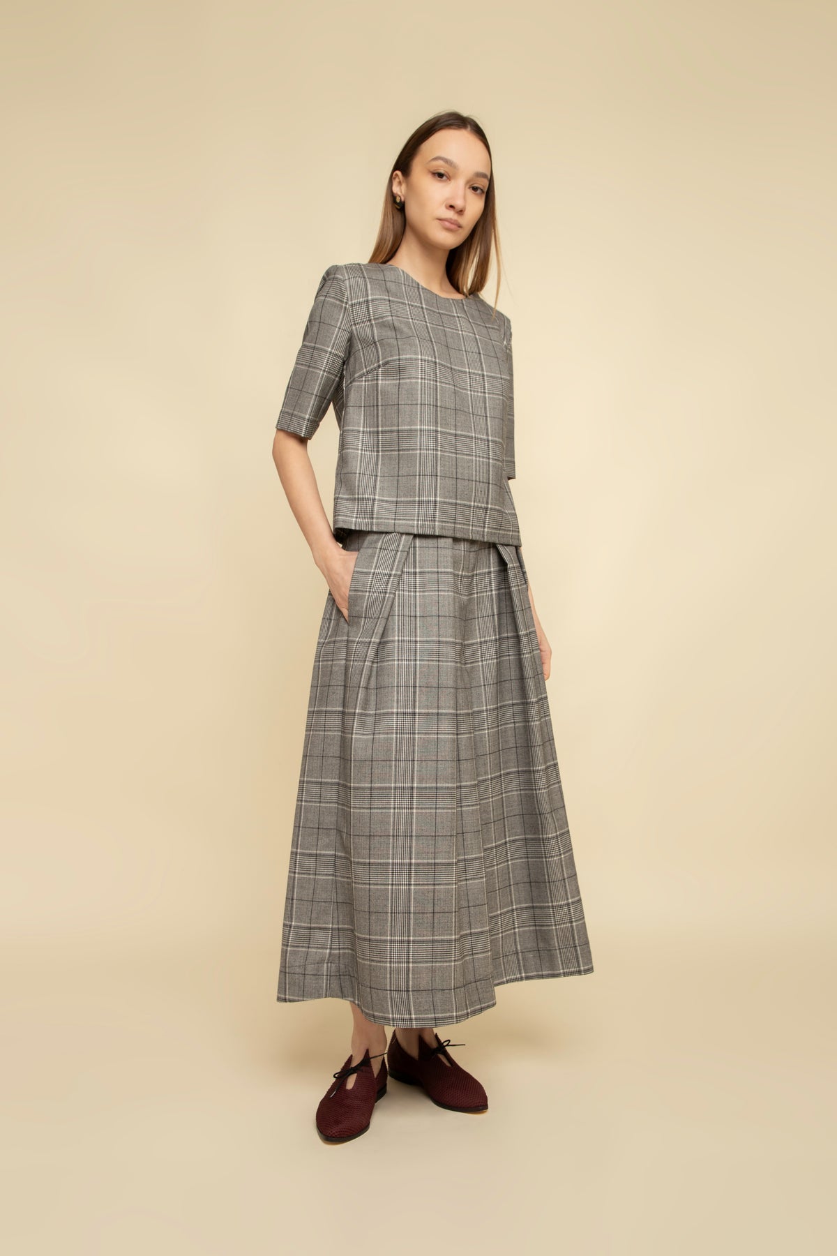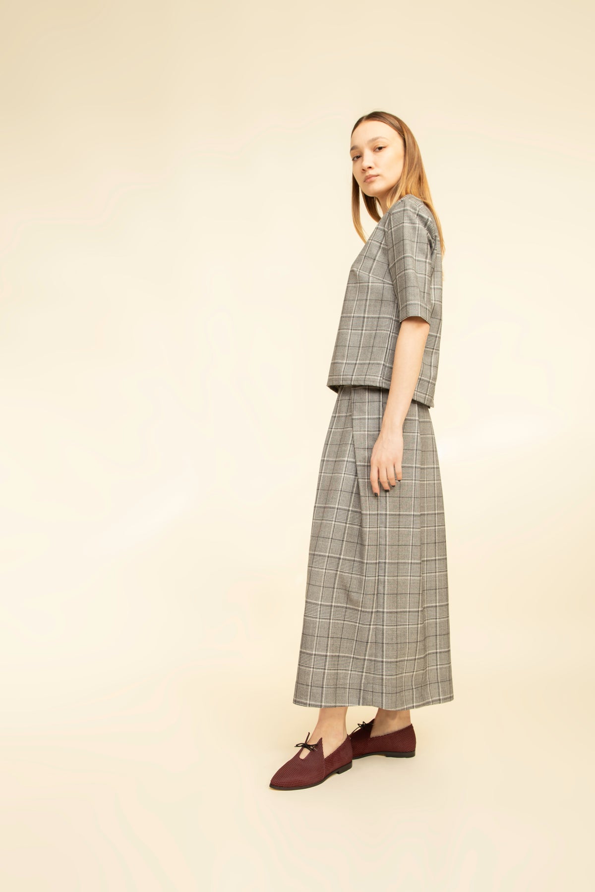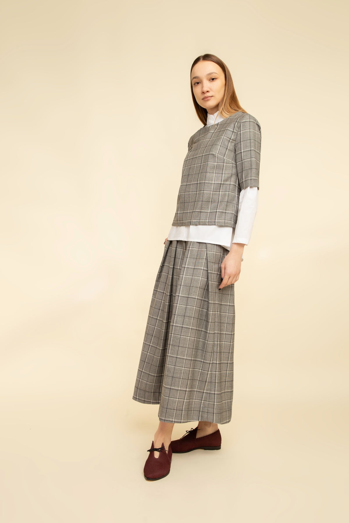 Effortlessly chic, endlessly comfortable. Crafted from 100% breathable lightweight wool, with a dynamic grey plaid print. Relaxed fit, mid-length sleeves and decorative botons on the back. Pairs perfectly with Obi pants. Wear it alone or in layers with Iris white shirt.